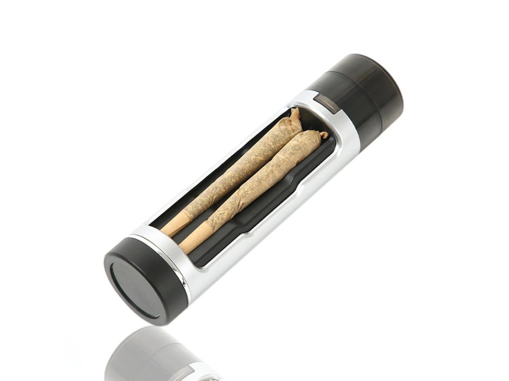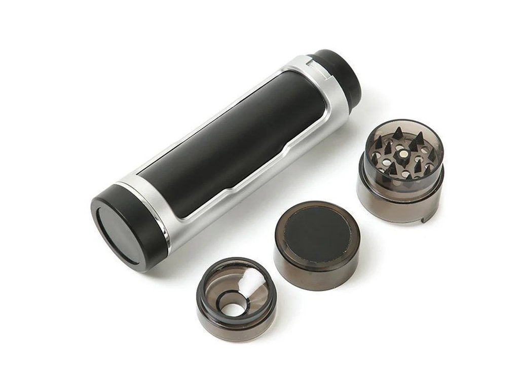 Praktická plastová 3v1 drtička s diamantovými zuby, magnetickým víkem, plničkou dutinek a skrytou úložnou komorou na dvě předrolované dutinky. Ideální řešení na cesty.